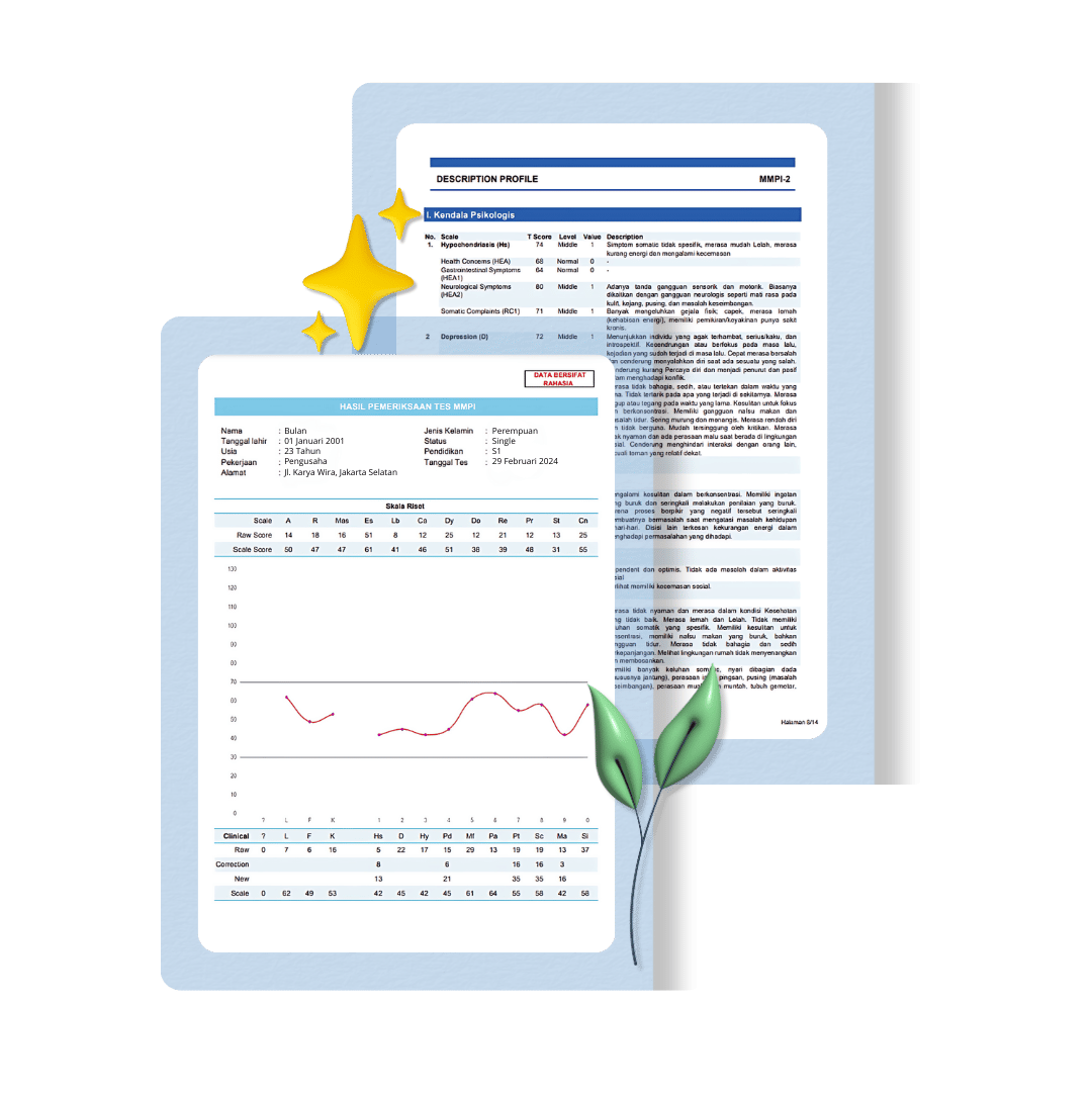 Laporan psikotes dibuat khusus dengan analisis mendalam oleh psikolog berpengalaman. Kami memastikan laporan yang kamu terima memberikan gambaran lengkap tentang kekuatan dan area pengembangan pribadimu.